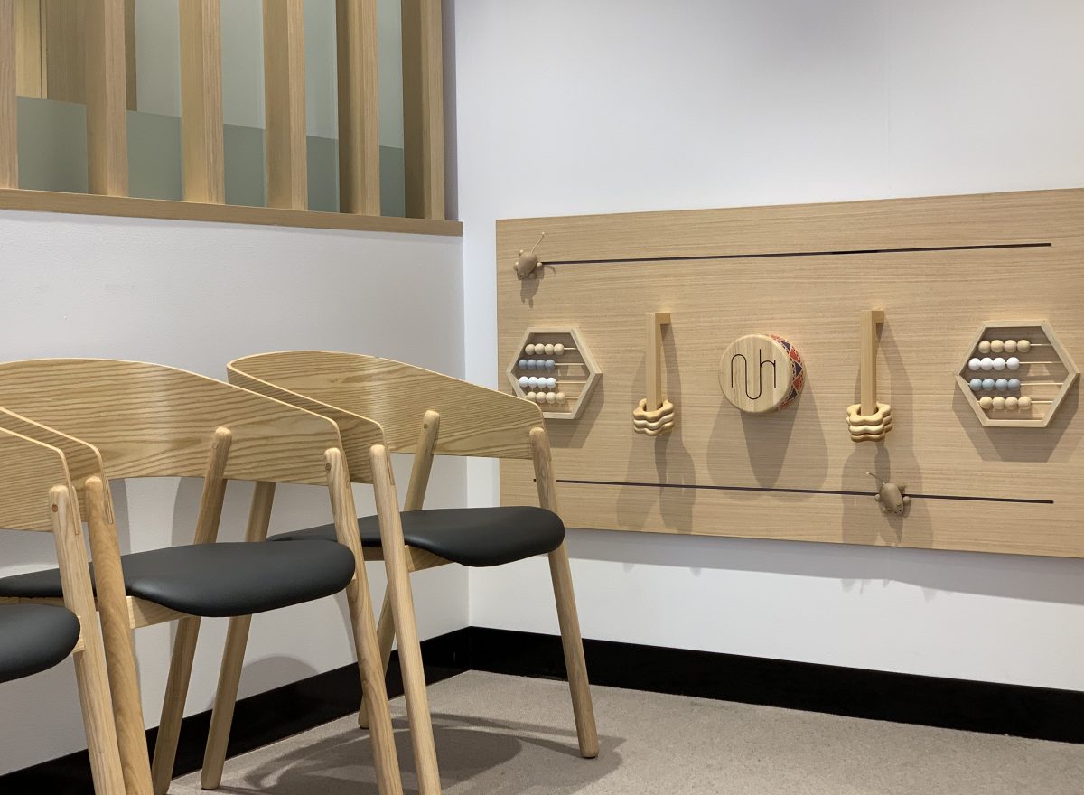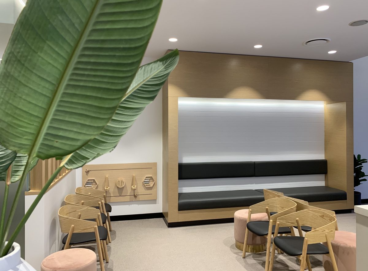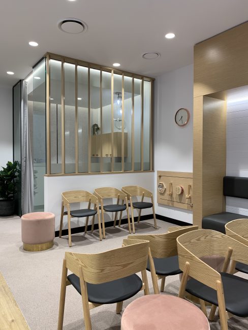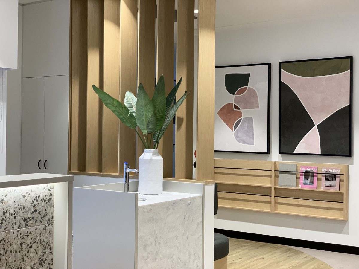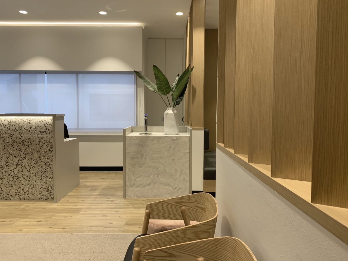 Caboolture Dental’s refurbishment enhances both functionality and atmosphere, creating a warm and inviting reception space. Textured finishes and subtle colourways in the flooring and joinery add depth and character, while feature lighting highlights key touchpoints and the unique entry ceiling. Abstract artworks complement the modern palette, seamlessly extending the refreshed aesthetic into the corridors.