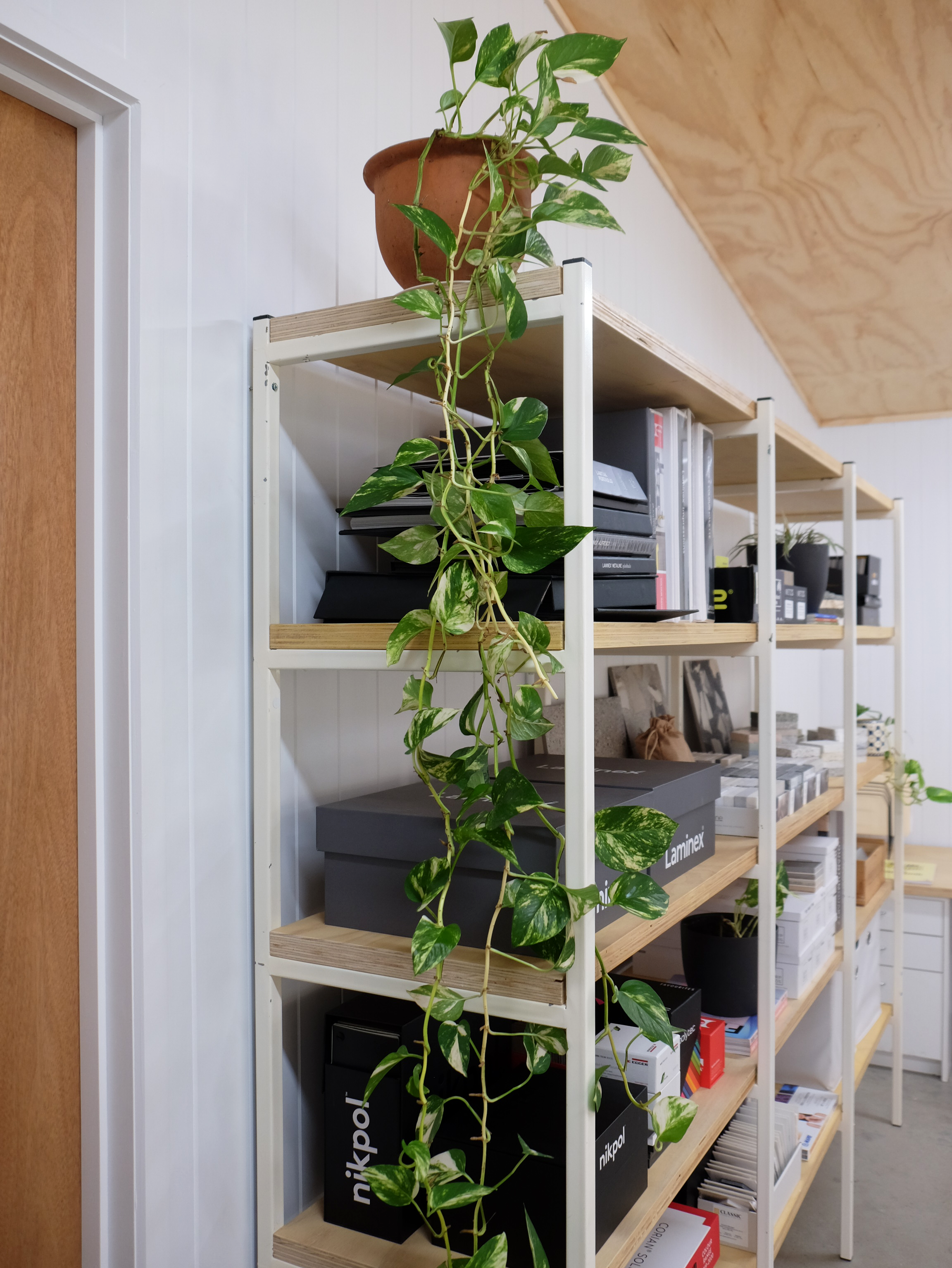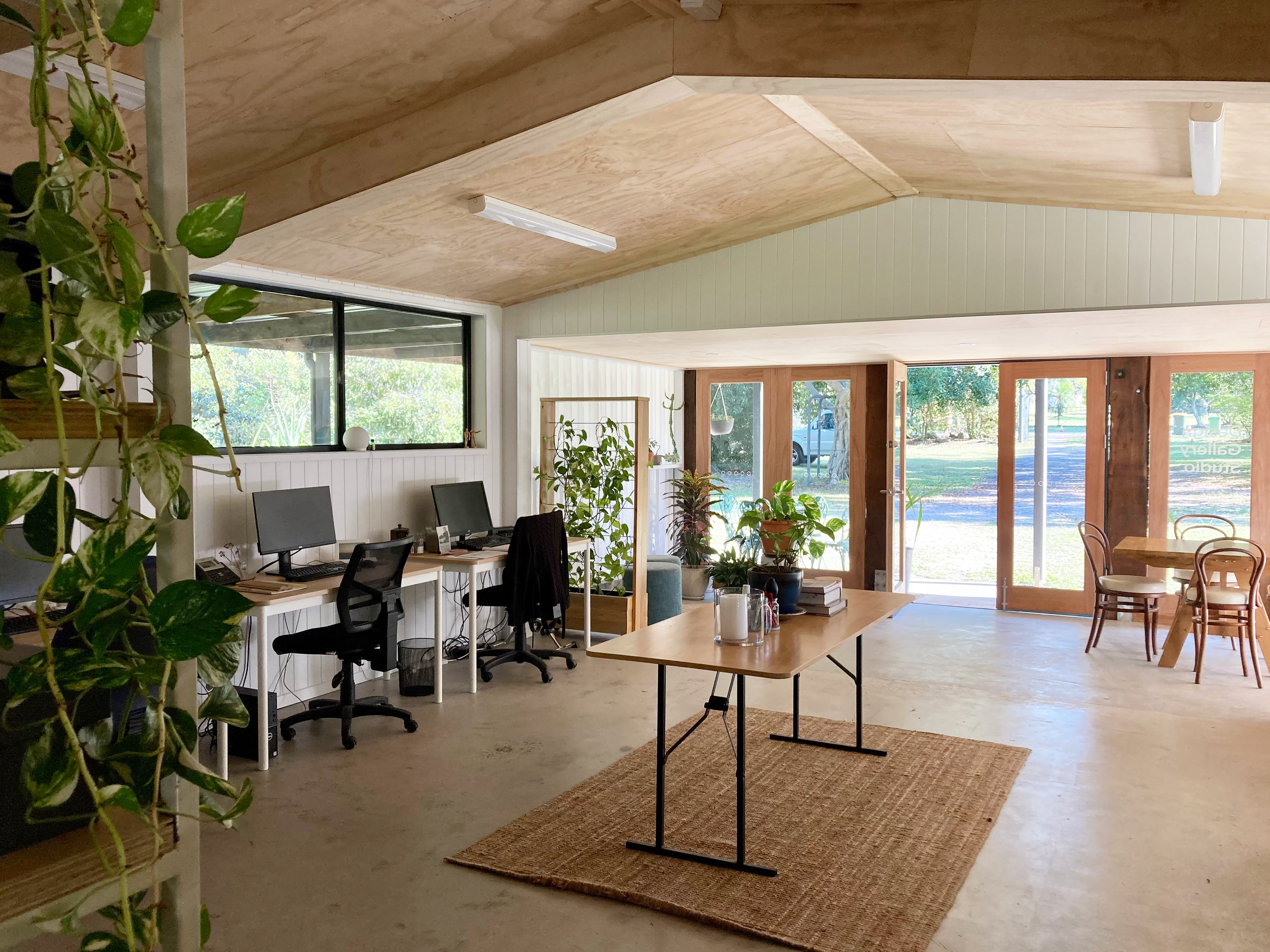 Set on a tranquil leafy acreage in Burpengary East, Design Gallery moved from a house-based worksapce into a former shed which the team transformed into a light-filled studio environment during the pandemic. Director Zita Czigany’s vision materialised with ply ceilings, VJ panelling, and polished concrete flooring, giving the space a cabin-like feel with a modern twist. The design team works in ‘The White Room’, a bright vibrant front of house area with timber framed glass panels, while ‘The Green Room’ houses the kitchen, break room, and storage, with deep green paint finishes creating a calming contrast.