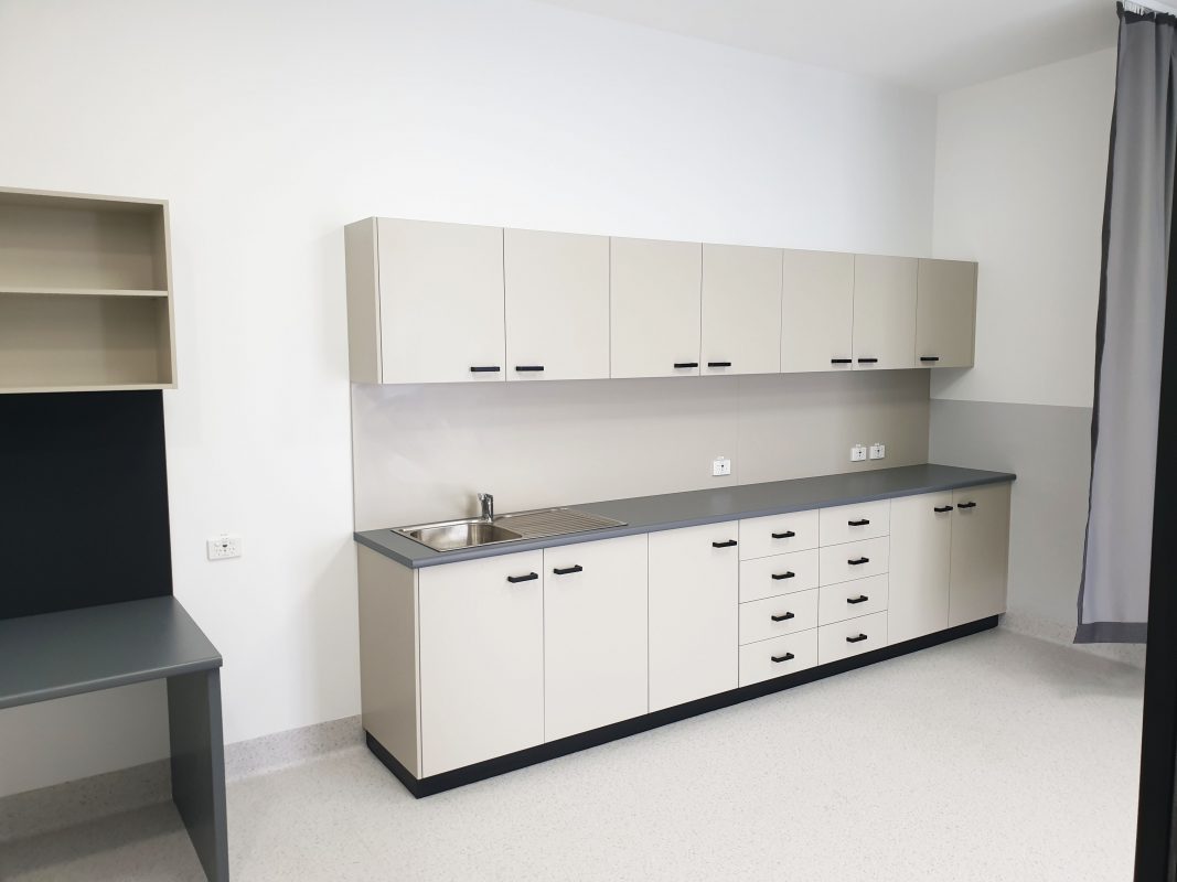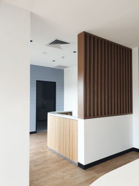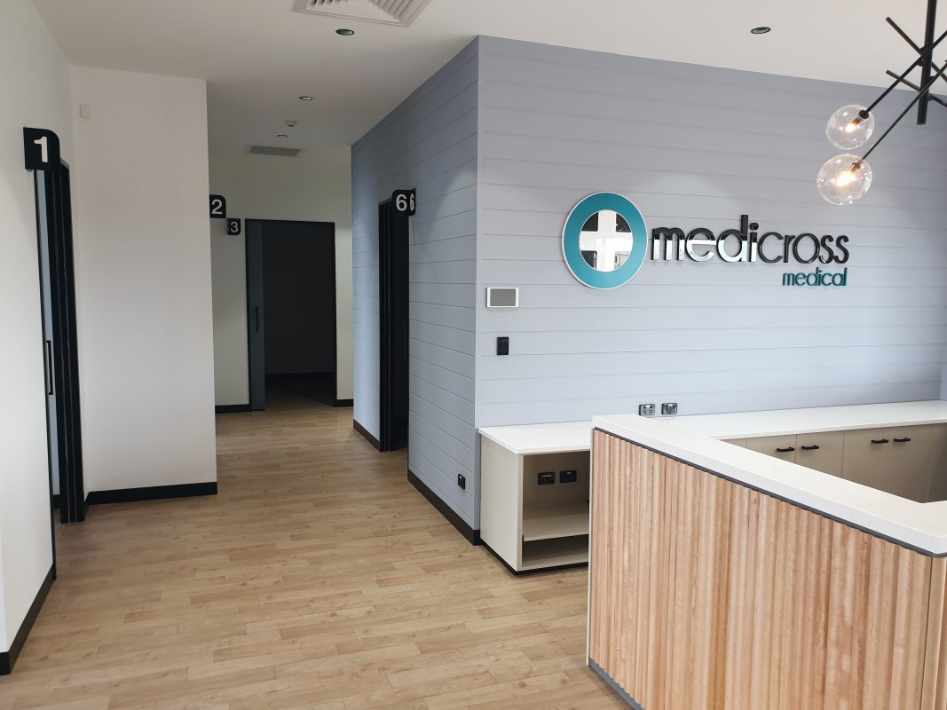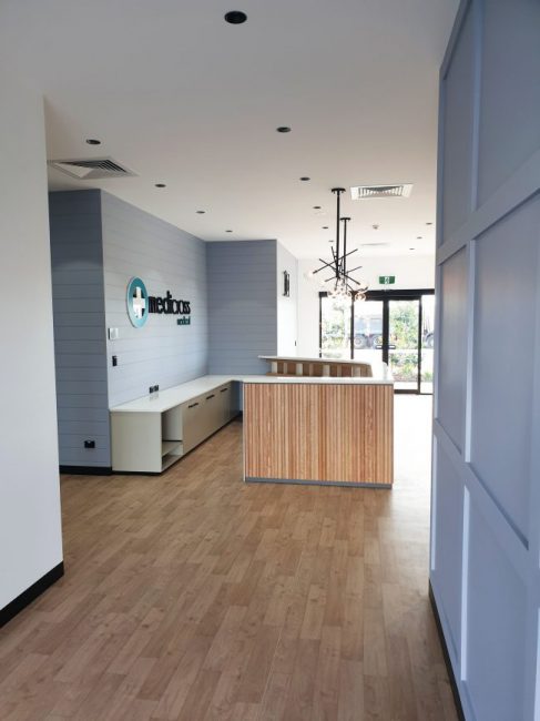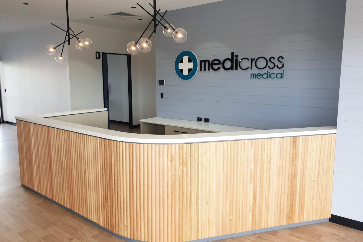 The Medicross design optimises a 270m2 space, seamlessly integrating front and rear reception access while accommodating consult rooms, a treatment area, staff room, and pathology zone. Soft timber flooring, light grey VJ board, and warm timber battens create an inviting atmosphere, while treatment rooms maintain a classic consult room feel. Delivered on a tight timeline, the result is a well-planned, comfortable space for doctors and patients alike.
